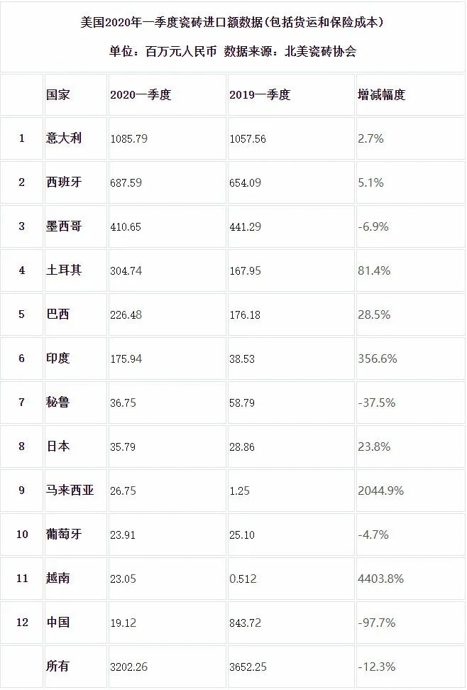 据报道,北美瓷砖协会公布了第一季度美国瓷砖进口数据。数据显示,美国一季度瓷砖进口量为3900万平方米,与2019年一季度的4600万平方米相比,同比下降14.9%。因美国对中国瓷砖进行反倾销,中国瓷砖基本退出美国市场,美国一季度对中国瓷砖的进口量从去年的1144万平方米,锐减至22万平方米,降幅高达98%。