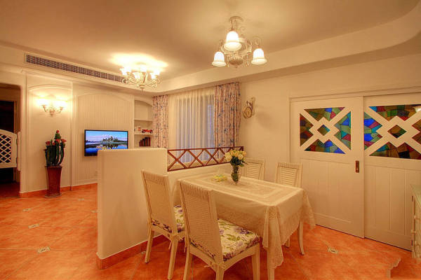 4、厨房,厨房是烹饪的地方,所以需要干净明亮,韩国人喜欢古董墙砖,所以,厨房墙可以选择浅色古董墙砖,白色家具,空间会显得明亮宽敞,同时,韩国厨房也需要在厨房角落配备餐桌,窗帘也是必不可少的,小花窗帘只是打破单调的色彩
