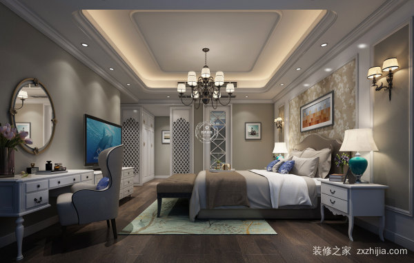 3.美式别墅装饰设计的卧室装饰以软装饰为主,多采用温馨复古怀旧的布艺,色调统一。卧室用复古台灯和壁灯代替顶灯,不同角度的灯具营造出卧室私人空间的独特情调。