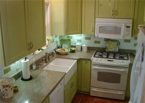 烹饪室是一个烹饪和烹饪的地方。家庭主妇在家呆了很长时间,不可避免地会感到闷热。为了让家庭主妇感觉更舒适,建议你用水果绿装饰厨房,创造一个清新舒适的烹饪环境。图片就是一个很好的例子。绿色橱柜门与红色古董地砖相匹配。它看起来清新优雅,给人良好的视觉享受。